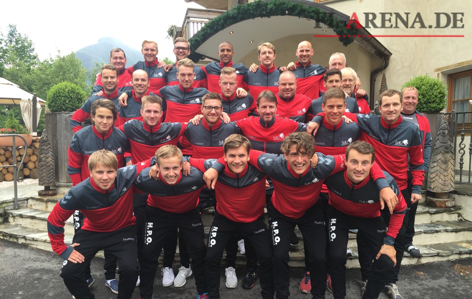 Det Sydslesvigske Fodboldlandshold i fredags lige efter ankomsten på deres hotel i Sand in Taufers. (Foto: FlA)