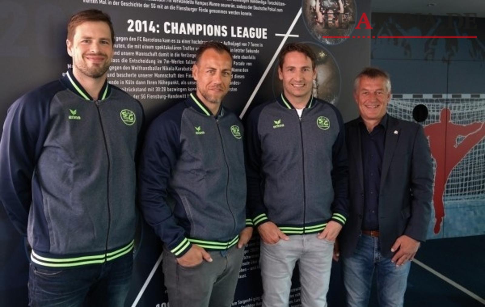 Glenn Solberg (2. von rechts) mit SG-Geschäftsführer Dierk Schmäschke (re.) sowie Meister-Chefcoach Maik Machulla und ganz links Assistenzcoach Mark Bult. (Foto: SG)