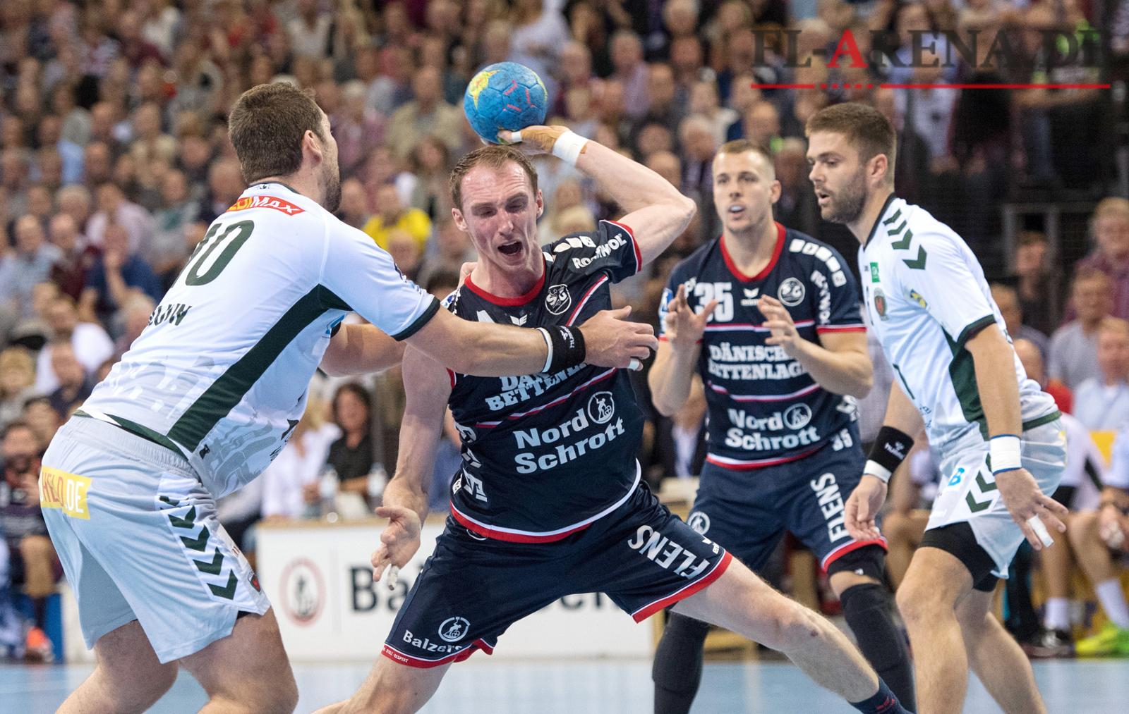 SG-Linkshänder Holger Glandorf (am Ball), hier bedrängt von Jakov Gojun, spielte gegen die Füchse weit unter Normalform. (Fotos: Tim Riediger)