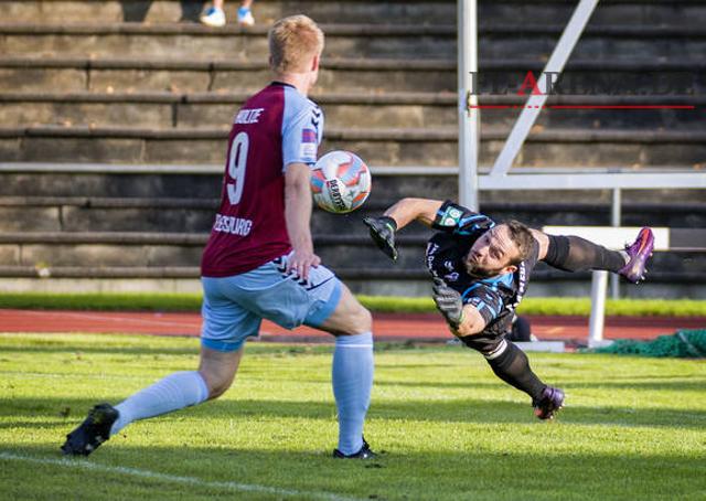 TSB-Keeper André Hagge hechtet dem Leder entgegen. SC-Angreifer Nicholas Holtze lauert auf die Torchance. (Fotos: Lars Salomonsen)