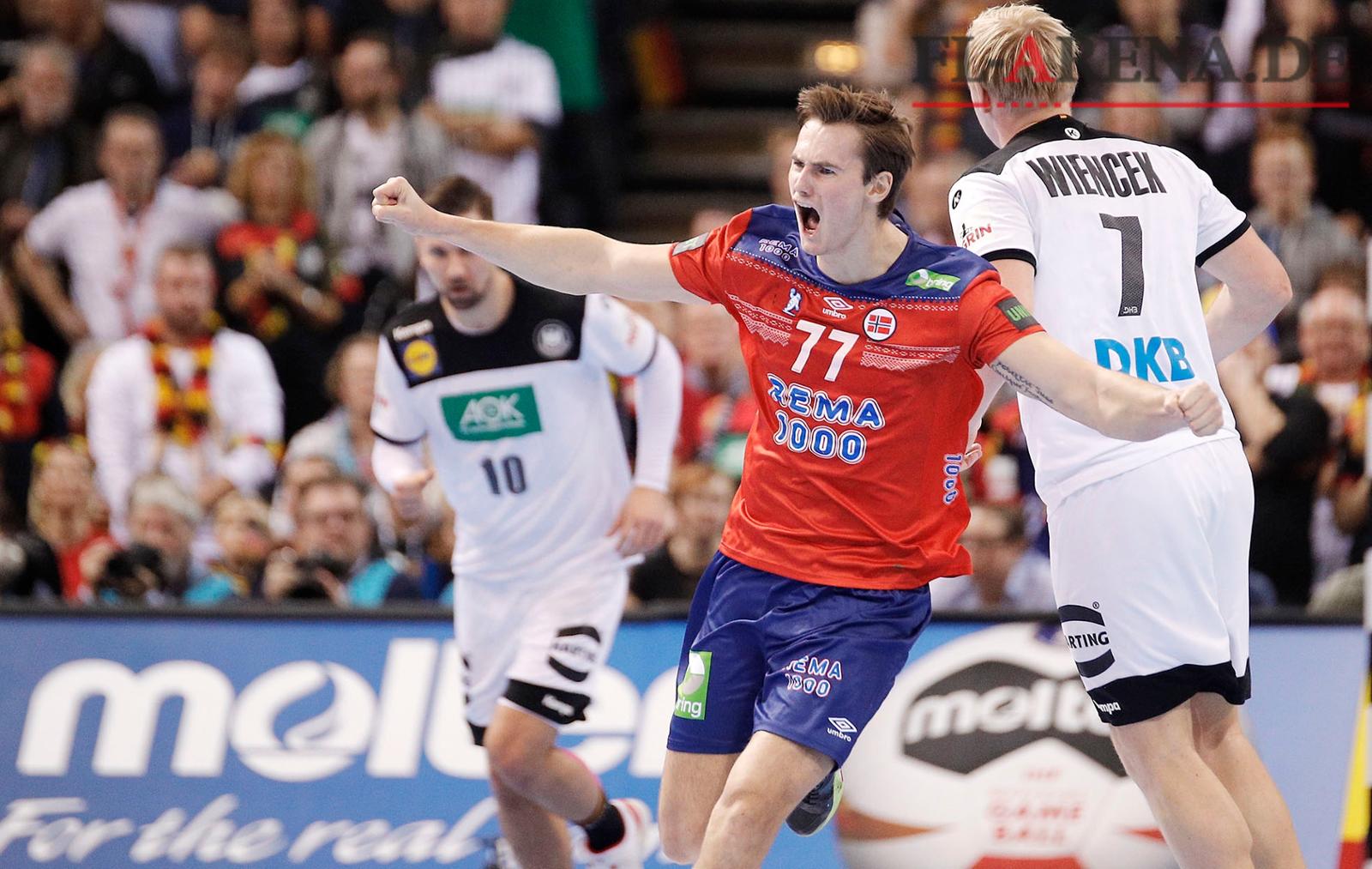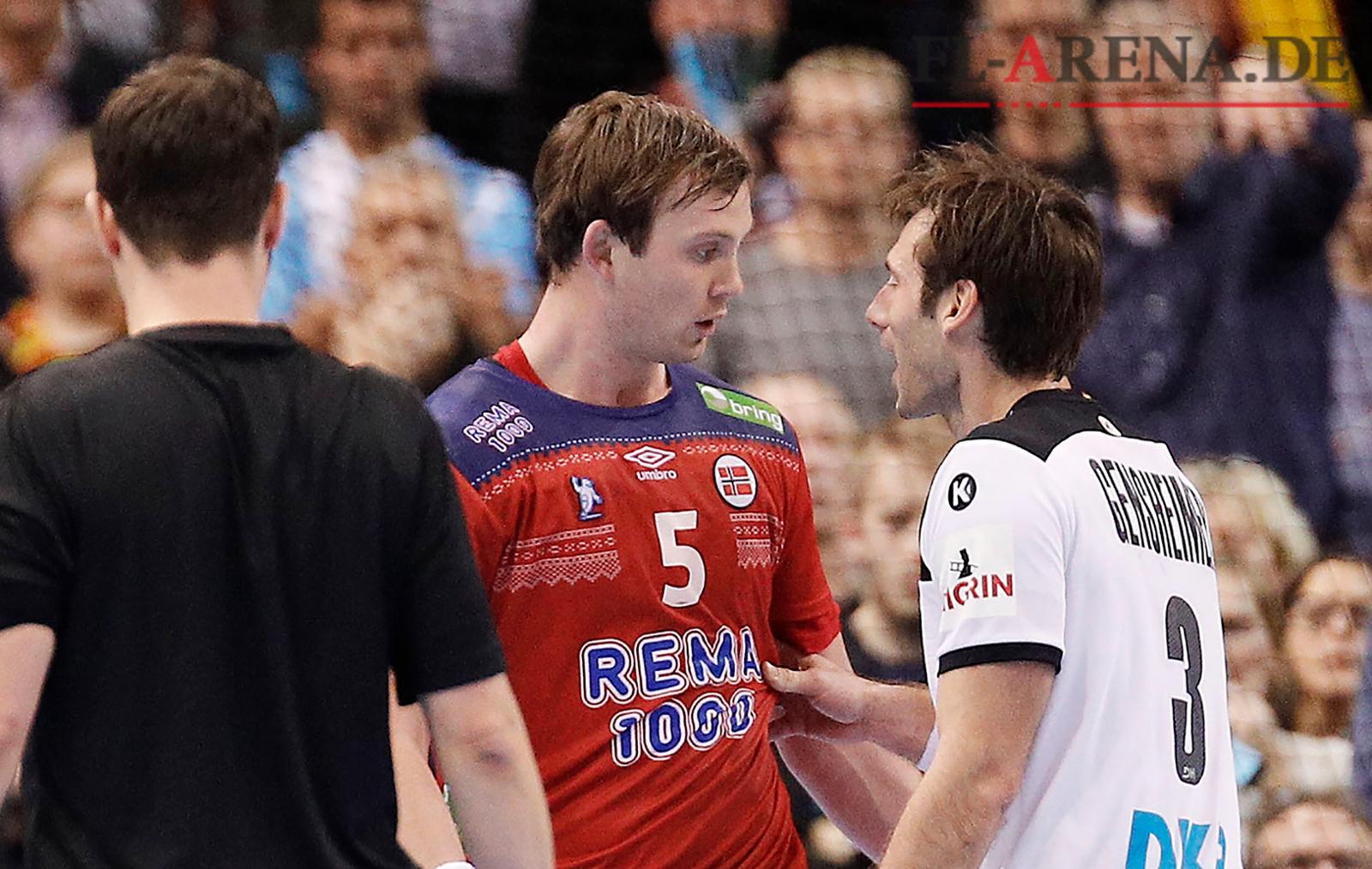 Norwegen begann mit Torbjørn Bergerud im Tor. Von der SG Flensburg-Handewitt gehörten außerdem noch Magnus Rød und Magnus Jøndal zur Startformation Gøran Johannessen saß auf der Bank. Während Jøndal als bester Torschütze der Norweger ohnehin Stammkraft ist, hat Rød sich inzwischen Rang eins in der Hierarchie im rechten Rückraum erkämpft. Er erzielte auch gleich das erste Tor der Norweger zum 1:1 (2.). Danach wurde er von Patrick Wiencek umgerissen, doch die Unparteiischen entschieden auf Stürmerfoul. Den nächsten Wurf fischte ihm Andreas Wolff weg. Nach einer Zweiminuten-Zeitstrafe gegen Steffen Fäth verkürzte Jøndal per Siebenmeter zum 2:3 (6.).