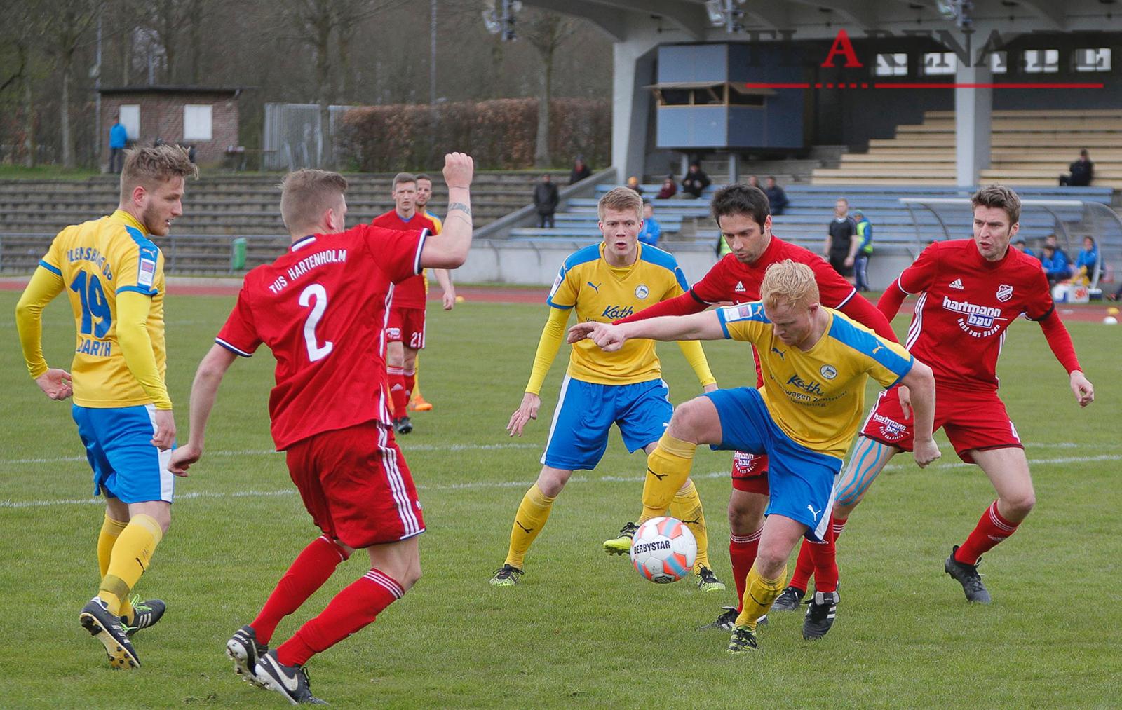 Flensburg 08 (in Blau-Gelb) kam mit 1:5 gegen TuS Hartenholm unter die Räder. (Foto: Lars Salomonsen)