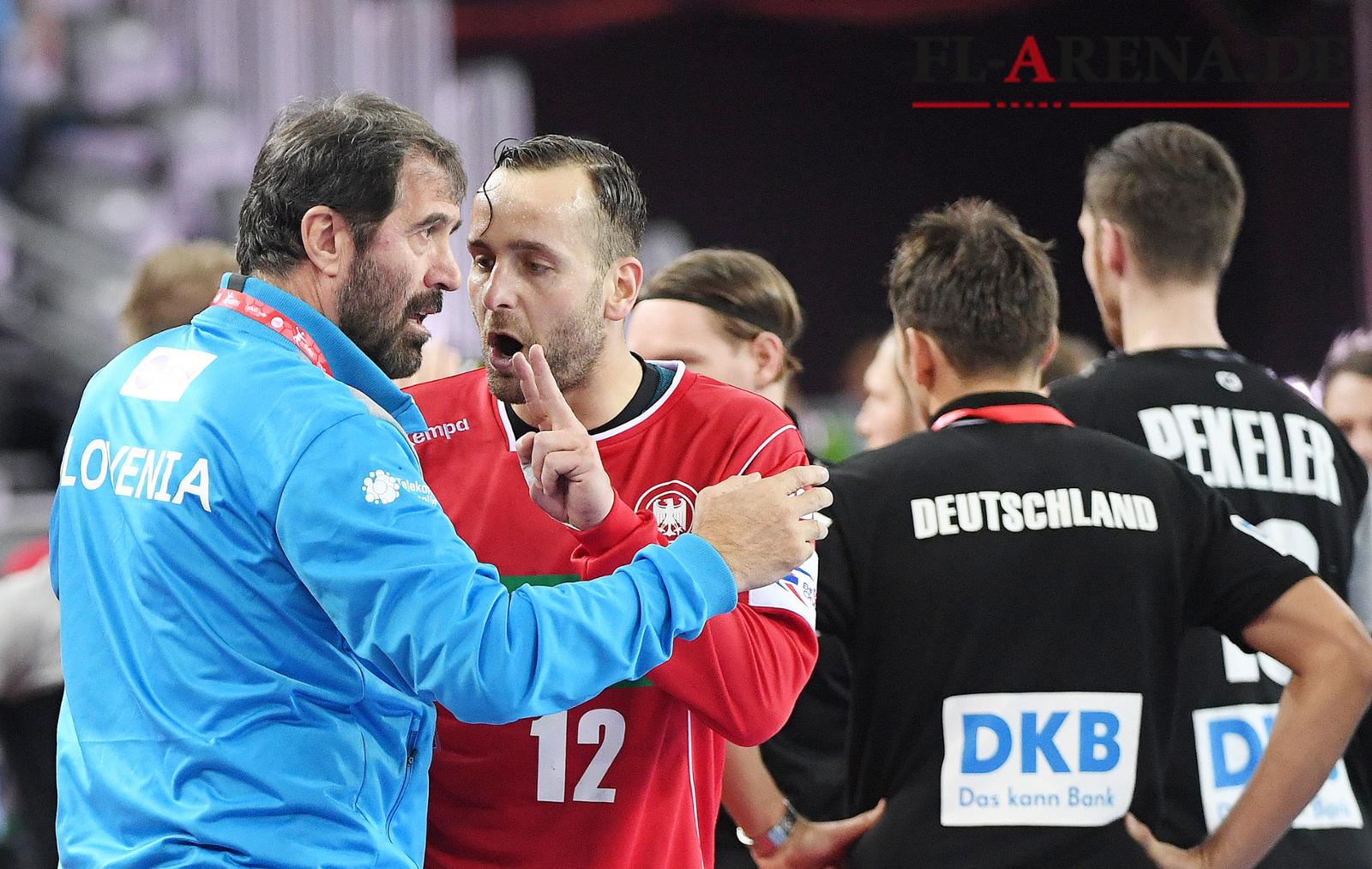 Emotionen pur: Deutschlands Torhüter Silvio Heinevetter (2.v.l.) mit Sloweniens Trainer Veselin Vujovic. (Foto: Monika Skolimowska/dpa)