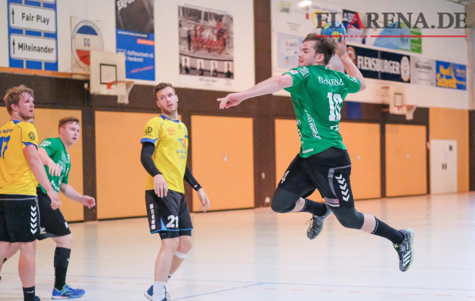 Wie kürzlich in der Handewitter Wikinghalle stehen Lasse Worm (am Ball) und sein DHK Flensborg auch diesen Sonnabend der HSG Nord-NF gegenüber. Diesmal auf Sylt. (Foto: Sven Geißler)