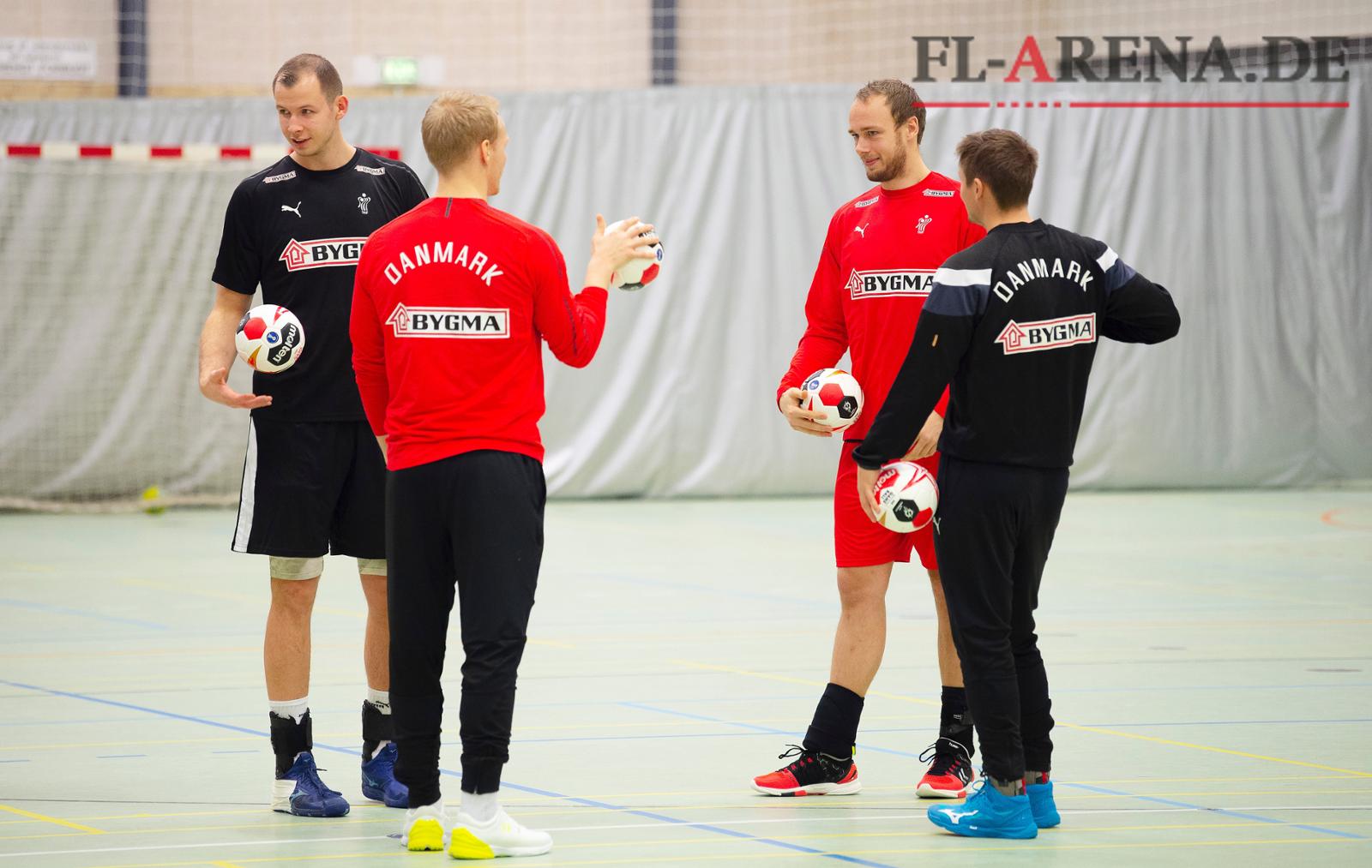 Den tidligere Flensborg-spiller Henrik Toft Hansen, nummer to fra højre, er skadet, og det betyder mere spilletid til SGerne Simnon Hald, til venstre, og Anders Zachariassen. Foto: Bo Amstrup, ritzau scanpix