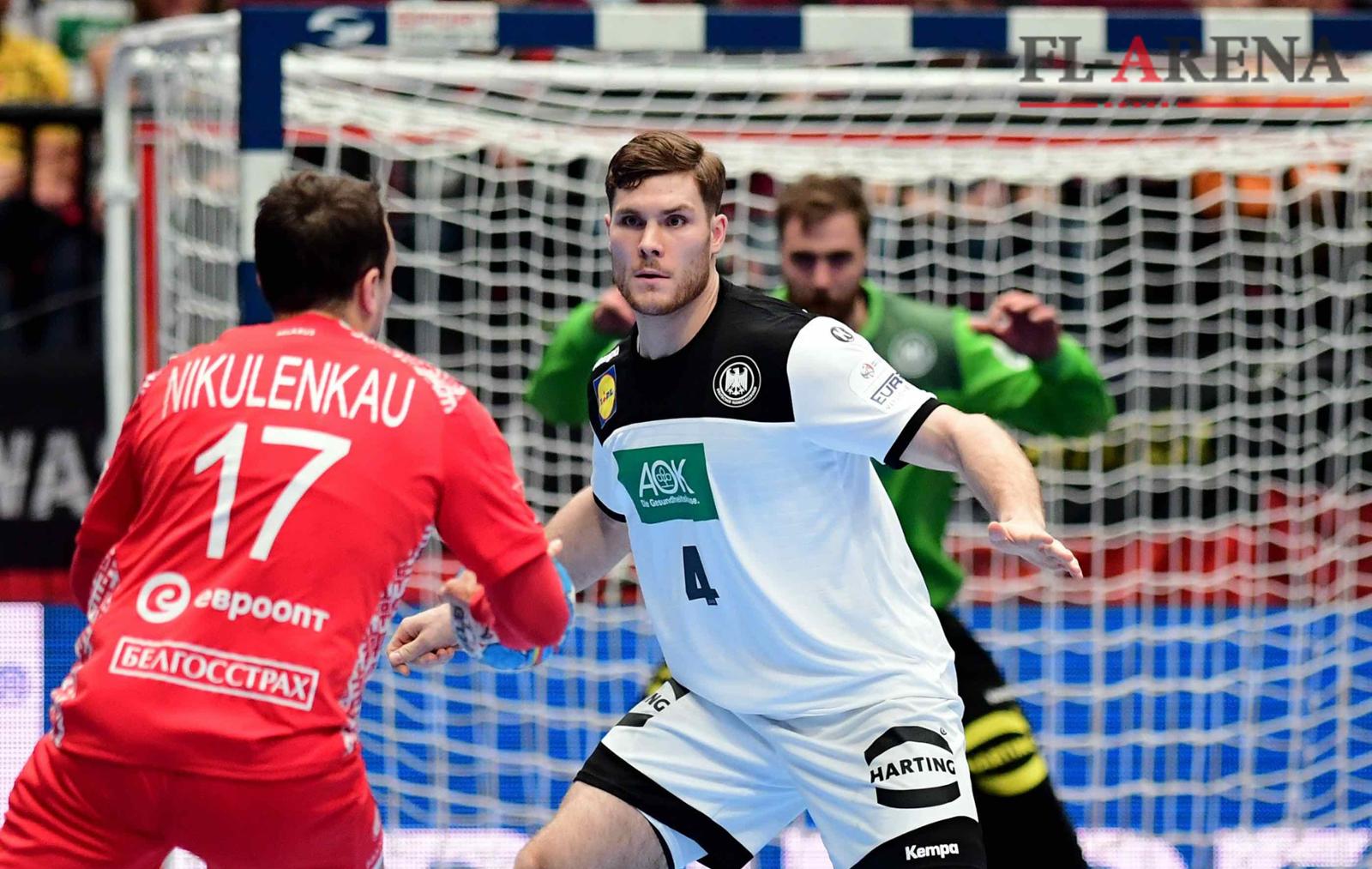 Johannes Golla (M) feierte sein EM-Debüt und spielte stark auf gegen Dmitri Nikulenkau und Weißrussland. Foto: Robert Michael/dpa