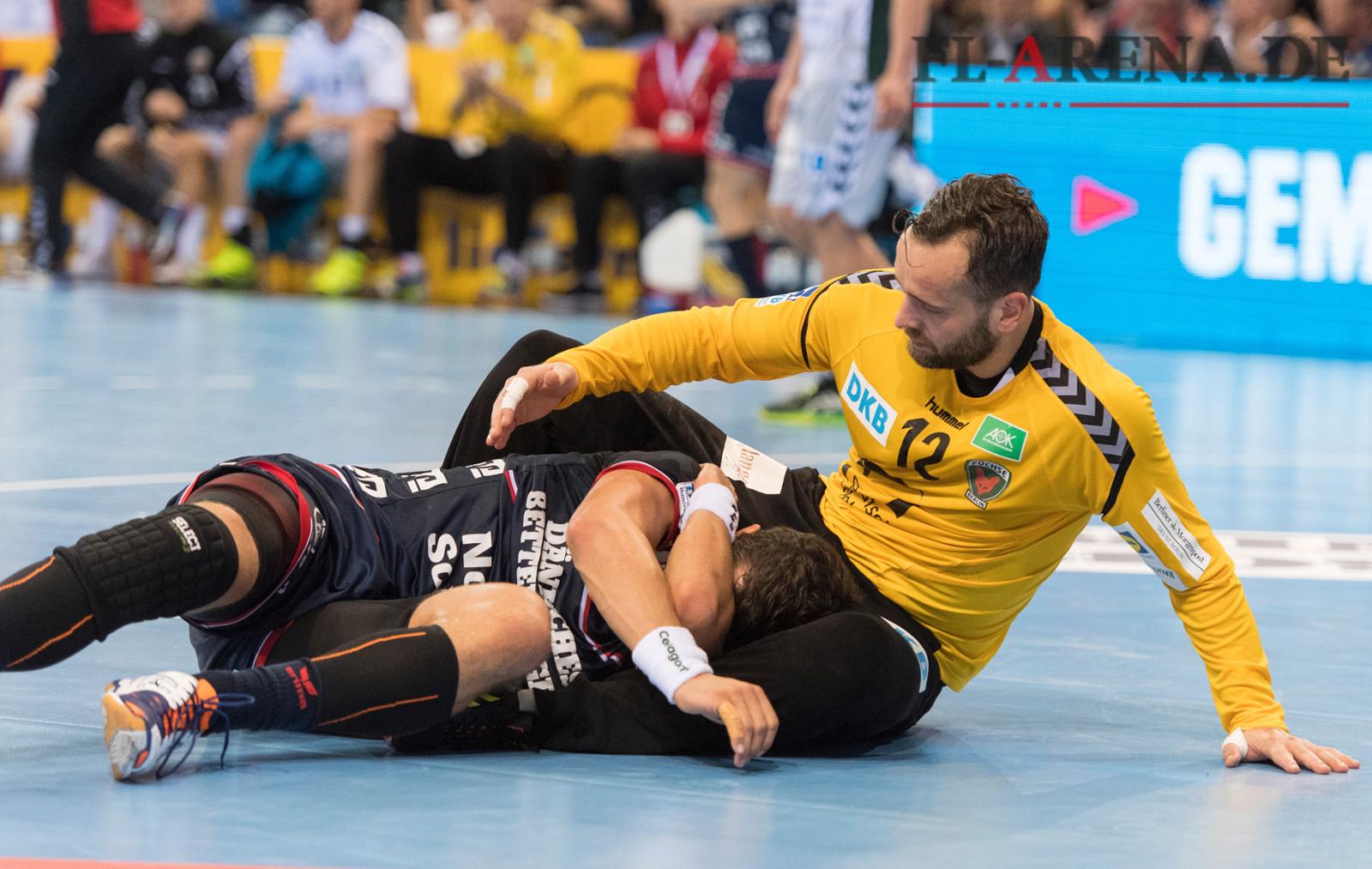 Der Däne Rasmus Lauge verletzte sich bei einer Angriffsaktion kurz vor der halbzeitpause. Rechts Füchse-Keeper Silvio Heinevetter. (Foto: Tim Riediger)