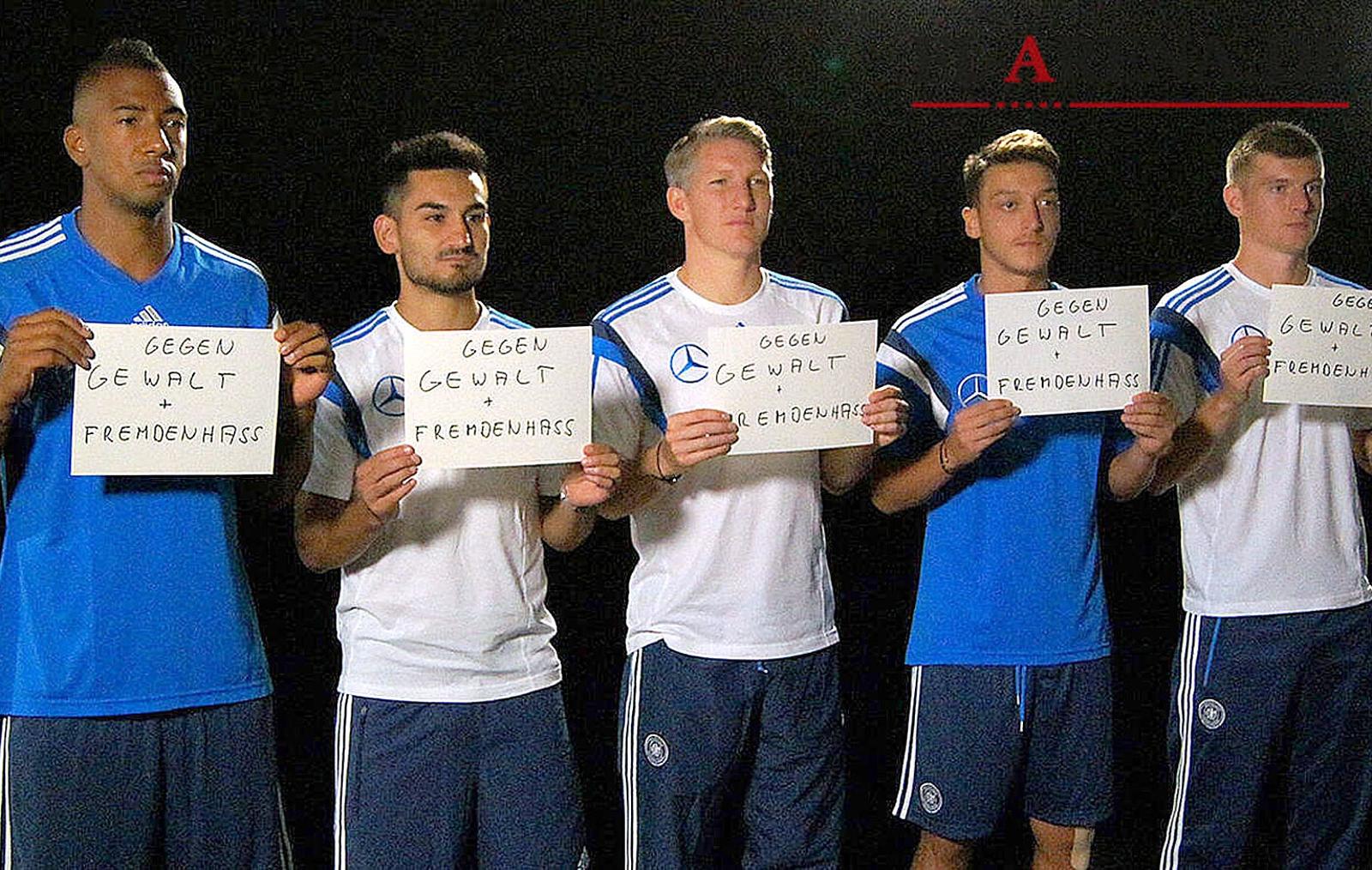 Die DFB-Elf um Jerome Boateng (v.l.), Gündogan,Bastian Schweinsteiger, Mesut Özil und Toni Kroos hat zum Thema Flüchtlinge klar Stellung bezogen. (Foto: DFB-TV/dpa)