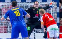 Den danske landsholdsspiller Anders Eggert (i rød) tager et straffekast mod sin holdkammerat, den svenske målmand Mattias Andersson. Til venstre er det Tobias Karlsson, ligeledes fra SG. (Foto: EHF, Sascha Klahn)