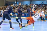 Kresimir Kozina setzt sich gegen Nikola Karabatic (li.) und die PSG-Deckung durch. (Foto: Eric Baledent/Maxppp/dpa)