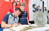 Simone Lange har tidligere inviteret SG og mestertræner Maik Machulla til at skrive i Flensborgs gyldne bog. Arkivfoto: Martin Ziemer