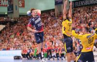 SG Flensburg-Handewitts Magnus Rød (l.) ist in bestechender Form, muss er auch in Wetzlar sein. Weder Holger Glandorf, noch Niels Versteijnen sind zur Entlastung dabei. Foto: Sven Geißler