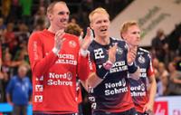 Unter Mannschaftskollegen darf Holger Glandorf (l.) derzeit nicht weilen. Dem Routinier wurde eine 14-tägige Quarantäne verordnet. Foto: Sven Geißler