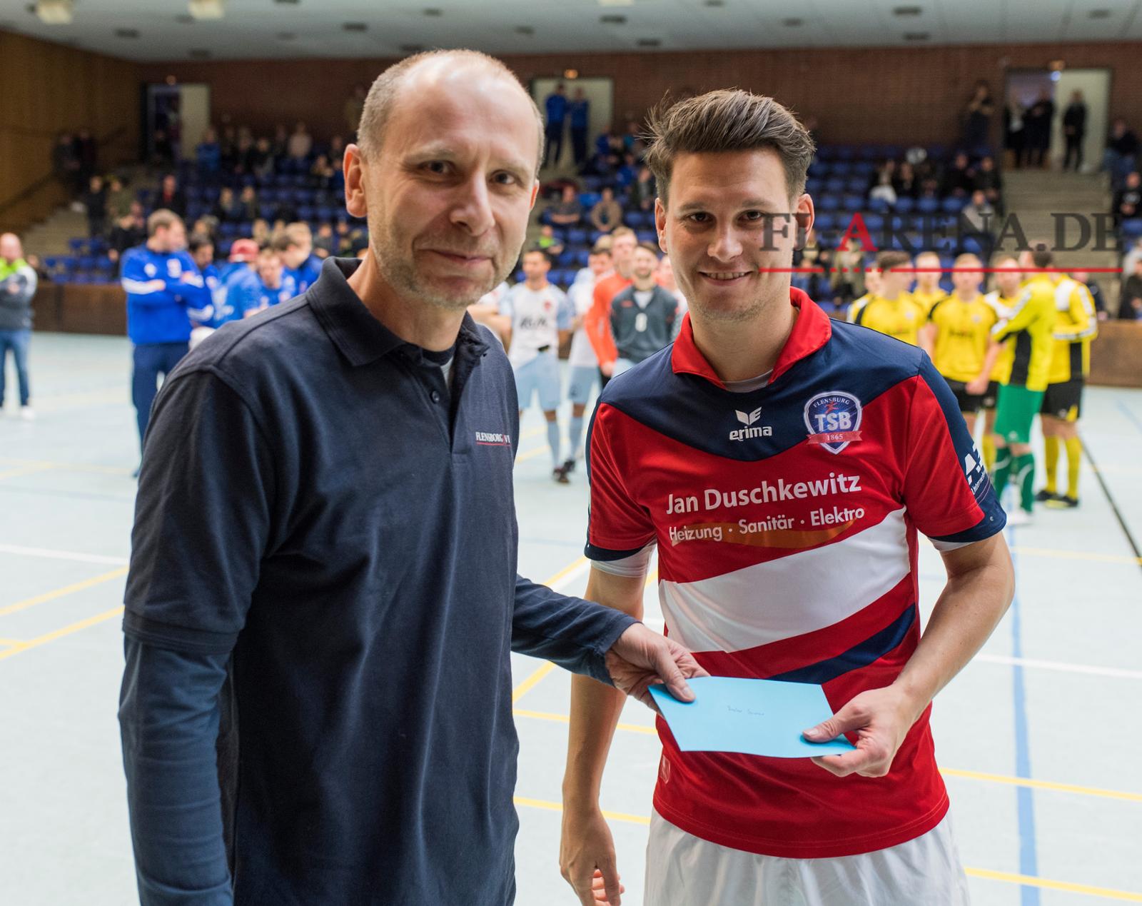 Flensborg Avis Marketingchef Hansjürgen Stiller zeichnete Lasse Sohrweide als besten Spieler aus. Sein Lohn: Ein Gutschein für die Physiotherapie Praxis Kai Hensen in Handewitt. (Foto: Tim Riediger/Martin Ziemer)