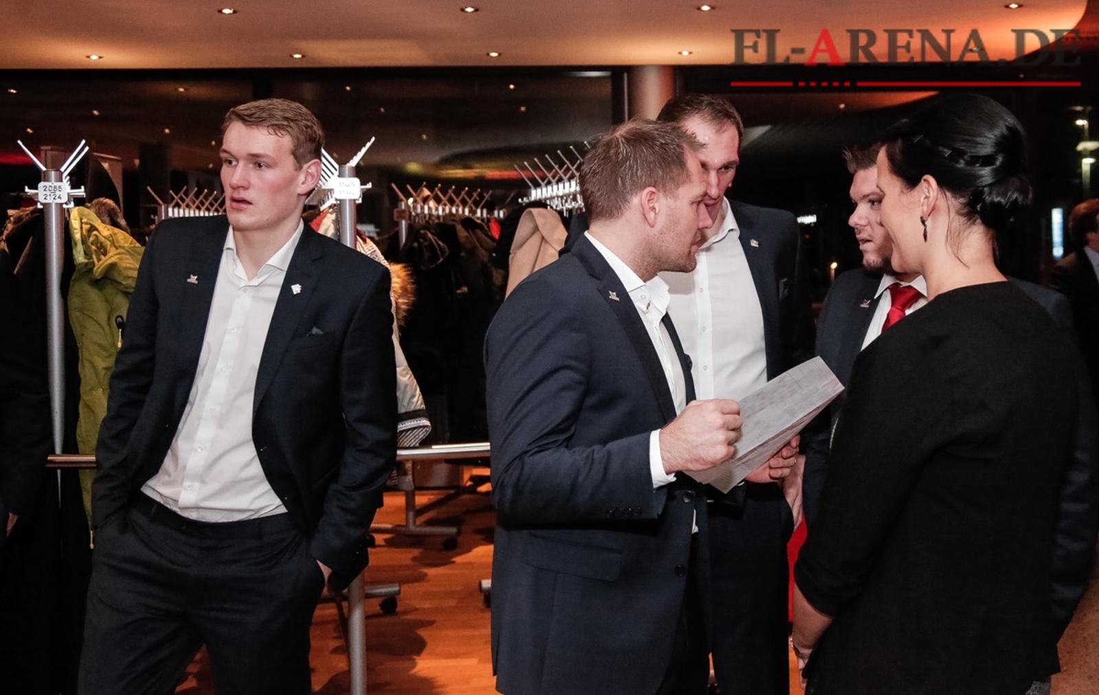 Mattias Andersson (mit Papier) studiert die Sitzordnung. Michael Nicolaien (l.) und Holger Glandorf sind gespannt auf die Verteilung. Am Ende mischten sich die SG-Spieler unter die vielen Besucher. (Foto: Lars Salomonsen)