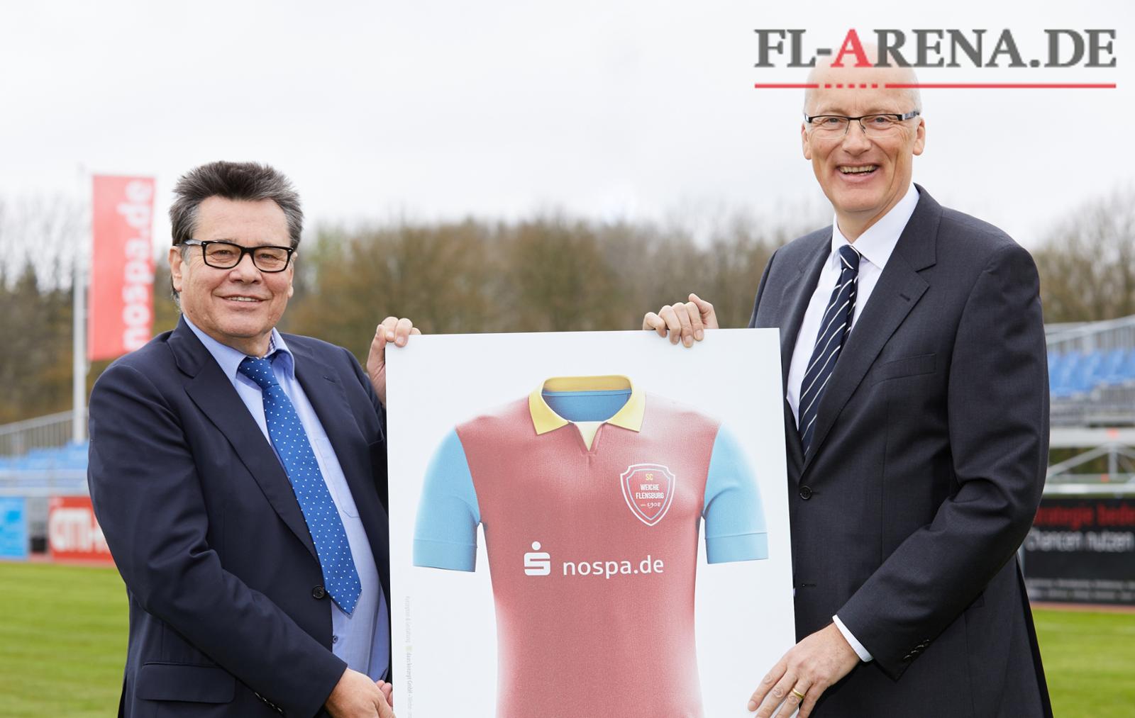 Bildunterschrift: Harald Uhr (li.) und Thomas Menke (re.) präsentieren das neue Trikot des SC Weiche Flensburg 08 ab der Saison 2017/2018. (Foto: daus:konzept GmbH)