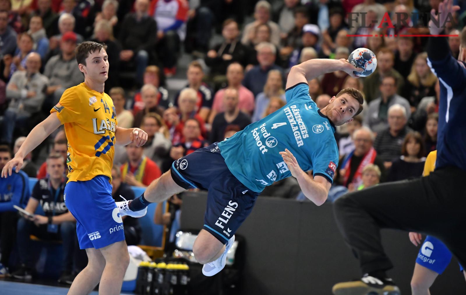 Flensburg stellte zehn Minuten vor der Pause die Abwehr um und agierte bis zur Halbzeit in der 5:1-Formation. Die Umstellung griff aber nur langsam. Dennoch erspielten sich die Gastgeber eine 15:12-Führung zur Pause, bei der insbesondere die Kreisläufer ihren vielen Platz weidlich nutzten und zehn der 15 Tore erzielt hatten.