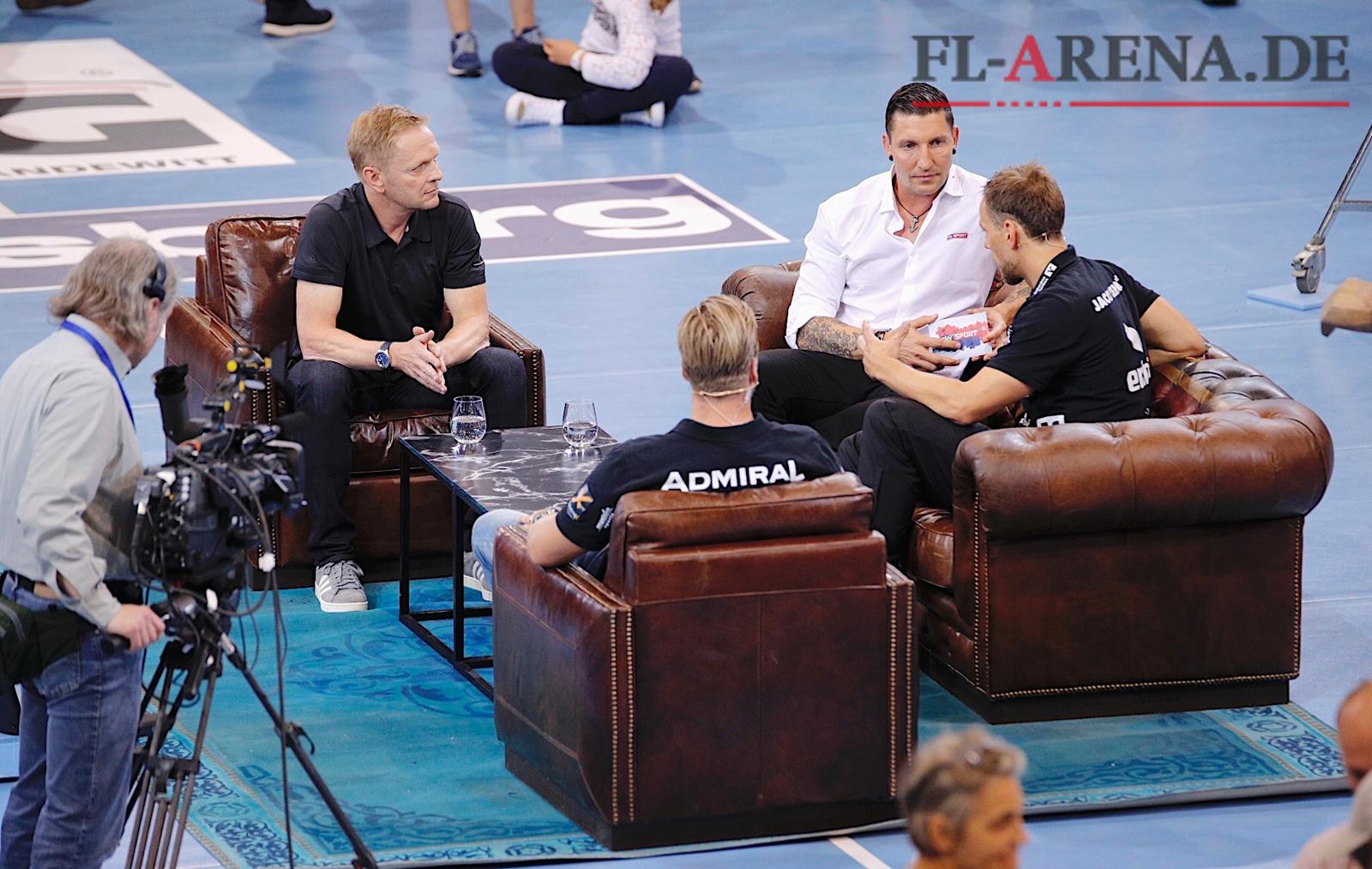 Um 17 Uhr, knapp eine halbe Stunde nach Abpfiff, ging »Kretzsche« mit seinen Gästen auf Sendung. In der Sitzecke an der Mittellinie der Flensburger Heimspielstätte nahmen SG-Coach Maik Machulla, Oliver Roggisch, sportlicher Leiter der Löwen und Thorsten Storm, Geschäftsführer des THW Kiel Platz.