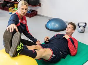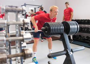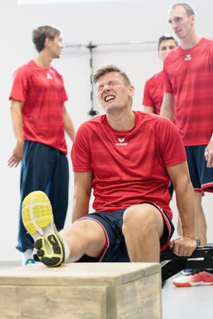 Der neue Co-Trainer, Mark Bult, war natürlich auch anwesend, trainierte allerdings wie geplant voll mit. »Er wird die gesamte Vorbereitung mitmachen, um Magnus zu entlasten und damit wir Holger die Zeit geben könne, die er benötigt«, so Machulla. Mit Holger ist Holger Glandorf gemeint. Der Linkshänder musste sich am Ende der vergangenen Saison einer Handoperation unterziehen und ist noch nicht voll belastbar. »Ich darf schon wieder werfen, aber noch nicht mit Körperkontakt trainieren«, so der Weltmeister von 2007, der im Kraftraum aber schon wieder herzhaft zupackte. Bis zum Saisonstart sollte er fit sein. Kevin Møller wird diesen definitiv verpassen. Der Däne fällt nach seiner Operation noch bis Jahresende aus. Er schaute am Dienstag Vormittag auf Krücken vorbei und zeigte sich schon wieder optimistisch. »Verletzungen gehören halt dazu. Ich nehme das als Lebenserfahrung und nach dem ersten Schock geht es mir auch schon wieder gut«, so der Däne, der unter Aufsicht von Physiotherapeutin Jana Kräber sogar schon wieder am Training teilnahm. Nach Schweden fährt er allerdings nicht mit. »Ich habe es ihm freigestellt, kann aber verstehen, dass er es nicht macht«, so Machulla. »Die lange Busfahrt wollte ich mir nicht antun. So arbeite ich lieber jeden Tag hier zu Hause am Comeback«, erklärte Møller, der sich im Juni beim Nationalmannschafts-Lehrgang an der Leiste verletzt hatte. Dadurch verpasste er auch die Leistungstests am Sonntag. In Kooperation mit dem Sportinstitut der Universität Flensburg ließ Machulla Laktattest und andere Auswertungen durchführen. »Im Bereich Leistungsdiagnostik wollen wir uns auch besser aufstellen«, so der 40-Jährige, der am Dienstag Nachmittag noch zu einer zweiten Einheit in der Halle bat.