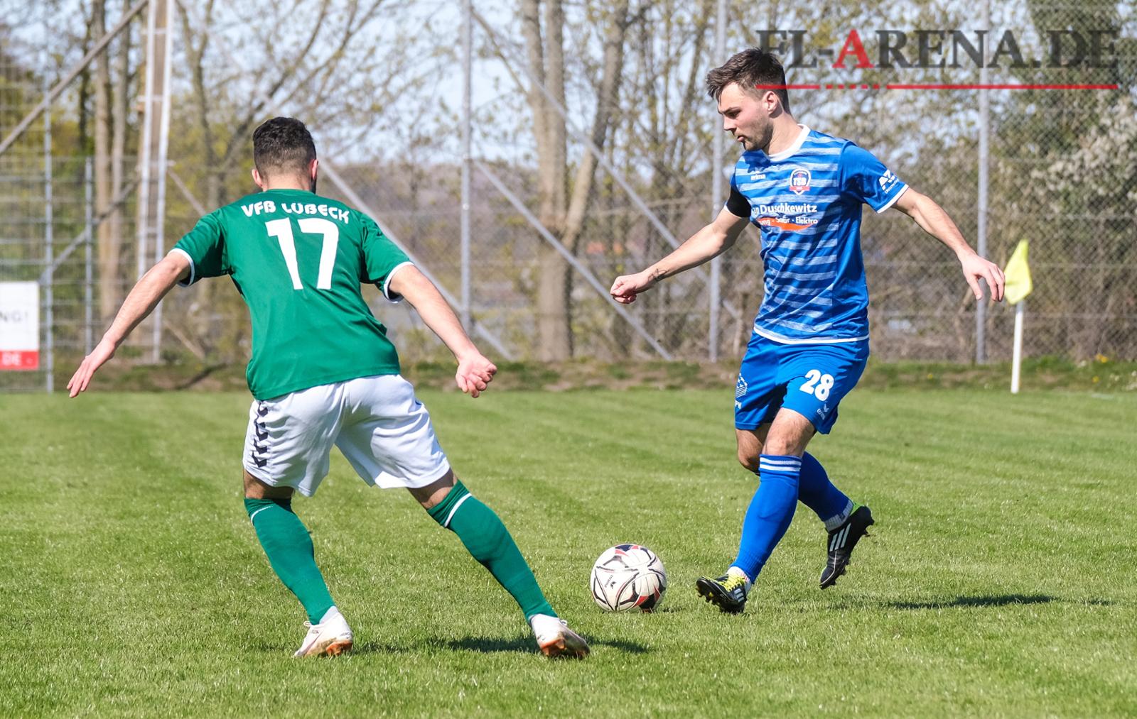 Lars-Ole Putins (r.) und der TSB Flensburg werden es auch in der kommenden Spielzeit wieder mit dem VfB Lübeck II in der Oberliga zu tun bekommen. Archivfoto
