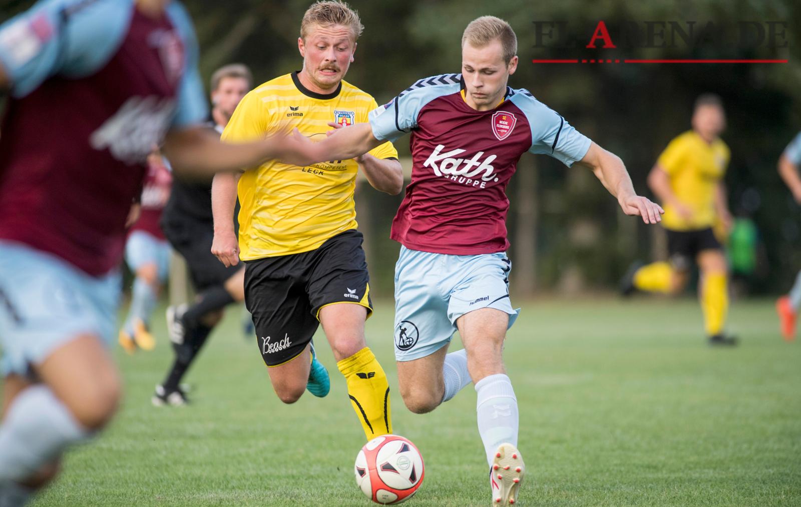 Vergangene Saison ging Tobias Zuth (am Ball), noch für Frisia Lindholm um Felix Stuewe (li.) auf Torejagd. Inzwischen ist Zuth im Oberliga-Team des SC Weiche Flensburg 08 II, das Freitagabend Besuch vom TSV Bordesholm hat. Stuewe und seine blendend in die Saison gestarteten Nordfriesen duellieren sich am Sonntag mit Eutin 08. Archivfoto: Martin Ziemer