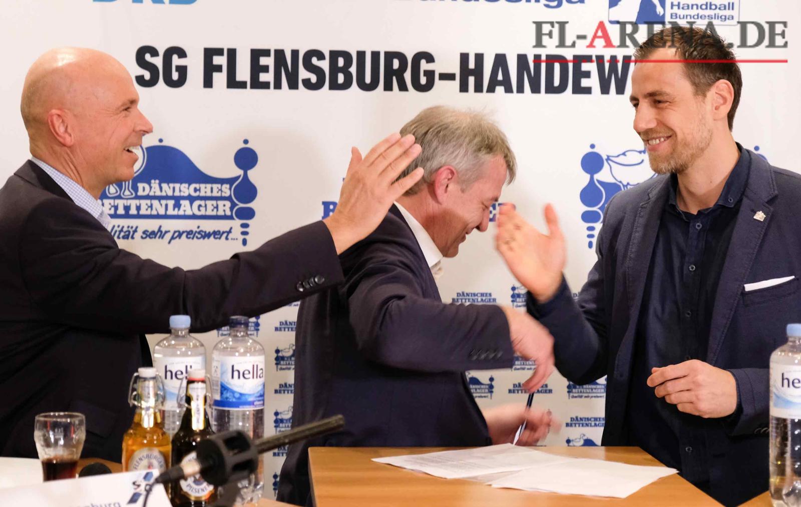Boy Meesenburg (l.), SG-Geschäftsführer Dierk Schmäschke und Maik Machulla (r.) bei der Vertragsunterzeichnung des Trainers im Frühjahr 2017. Etwas mehr als 12 Monate später gewann das Trio gemeinsam die zweite Meisterschaft der Vereinsgeschichte. Archivfoto