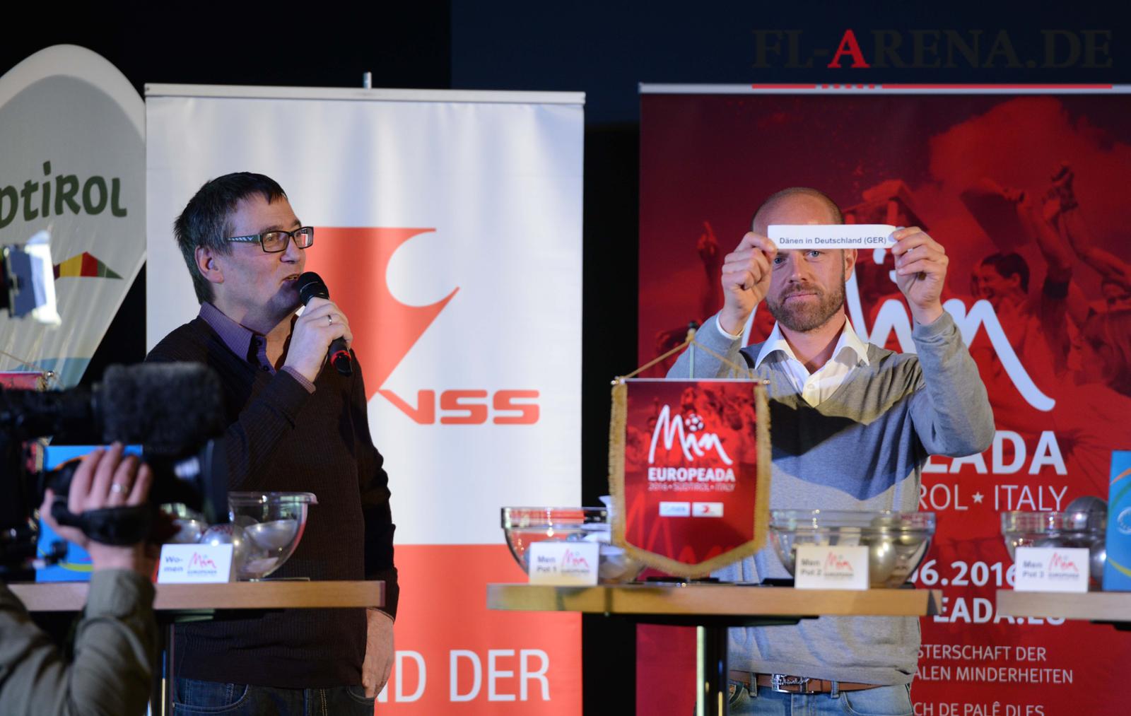 Hans-Rudi Brugger trak sydslesvigernes lod. Organisationschef Siegfried Stocker (t.v.) kommenterede lodtrækningen. (Foto: Dlife)