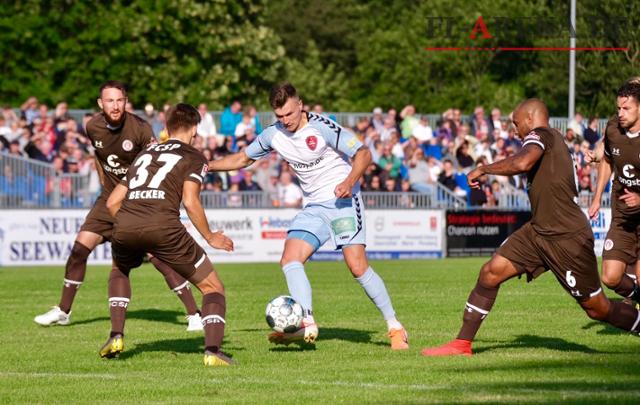 Dabei ging das Spiel für die Hausherren schlecht los. Mit den ersten Angriffen stand die SC-Defensive bereits mächtig unter Druck und in der 6. Spielminute drückte Dimitrios Diamantakos eine scharfe Hereingabe ins Tor. Die Hausherren konnten sich im Laufe der ersten Hälfte kaum einmal aus der Umklammerung der Kiez-Kicker befreien. Immerhin: In der Abwehr standen sie mit zunehmender Spieldauer besser und ließen immer weniger gefährliche Situationen zu.