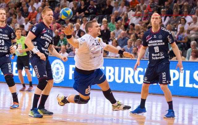 Mit Eisenach war Nicolai Hansen (M) auch Gast in Flensburg, hier ist er in Aktion gegen Johan Jakobsson (r.) und Jim Gottfridsson (l.). (Foto: Bejamin Nolte/dpa)