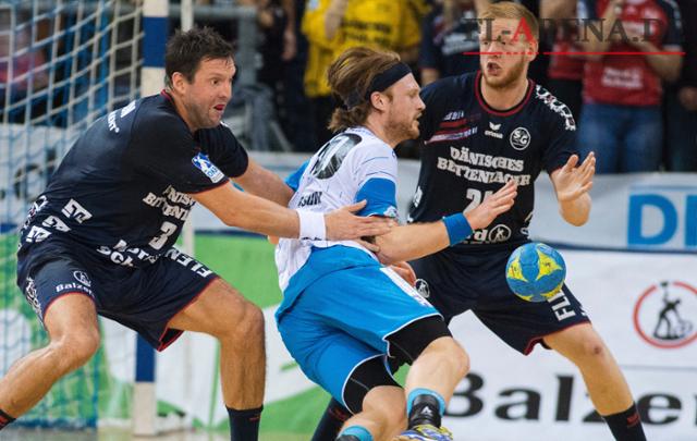 Kasper Kisum (Mitte) im Trikot des TVB Stuttgart im Vorjahr gegen seine ehemaligen SG-Teamkollegen Tobias Karlsson (li.) und Jim Gottfridsson (re.). (Archivfoto: Tim Riediger)