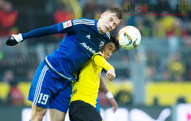 Der Senkrechtstarter: Ingolstadts Max Christiansen (links) hier im Duell mit Dortmunds Shinji Kagawa. (Foto: Bernd Thissen/dpa)