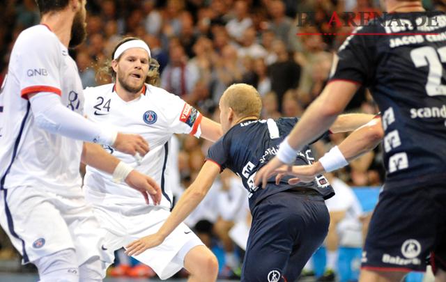 Mikkel Hansen (in weiß, Nr. 24) und Paris Saint-Germain kommen erneut in der Vorrunde in die Flens-Arena. Am 19. September 2015 schickte die SG die Pariser Star-Truppe mit einer 32:39-Niederlage zurück in die französische Hauptstadt. In Paris gewann PSG das zweite Aufeinandertreffen dieser Gruppengegner mit 35:32. (Archivfoto: Martina Metzger)