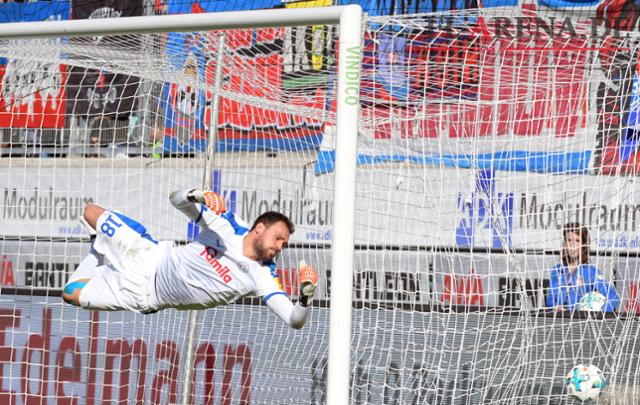 In dieser Szene ließ Holstein-Keeper Kennth Kronholm den Ball passsieren, ansonsten befindet er sich aber seit Wochen schon mit den »Störchen« im Höhenflug. (Archivfoto: Stefan Puchner, dpa)