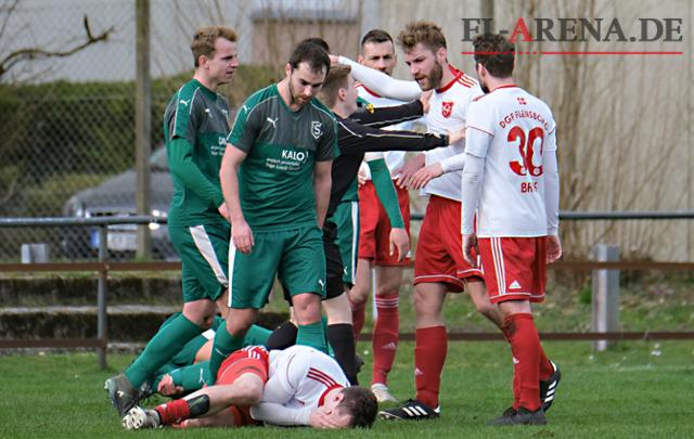 Dabei starteten die Gastgeber gut in die Partie und konnten durch Kapitän Marcel Steiner (29.) in Führung gehen. Doch viel Zeit zur Freude blieb nicht. Bjarne Fiege (30.) konnte fast im direkten Gegenzug für die clever spielenden Gäste aus Nordfriesland ausgleichen. Richtig rund ging es aber dann erst wieder kurz vor der Pause, als DGFs Leif Grüter und TSV-Torschütze Bjarne Fiege, durch den guten Schiedsrichter Matthias Hendrik Müller, vorzeitig zum Duschen durften. Kapital aus dem vorhandenen Platz konnten die Gäste noch vor der Pause durch Rouven Böckenholt (45.+2) schlagen und eine überraschende 2:1-Führung mit in die Pause nehmen.