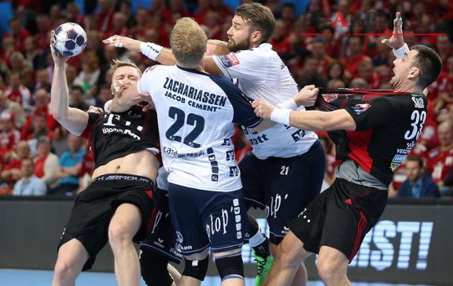 Jacob Heinl (Nr. 21) und Anders Zachariassen (Nr. 22) hatten gegen Aron Palmarsson (l.) und Renato Sulic einen schweren Stand. (Foto: ingrid Anderson-Jensen)
