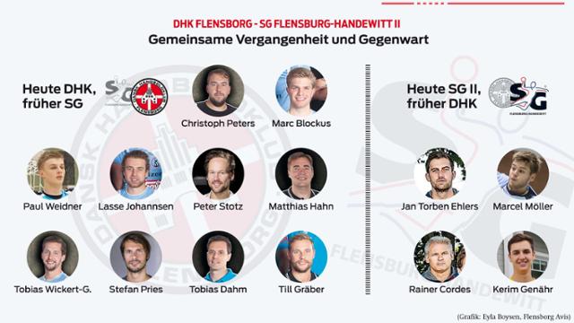 Umgekehrt haben lediglich vier SGer einen DHK-Hintergrund. Beide DHK-Torhüter, Paul Weidner und Christoph Peters, haben einst das SG-Trikot getragen. Weidner, bis zu seinem Wechsel zum DHK im Sommer 2014, viele Jahre in der Jugend und auch für die Zweite. Peters hat einst für die SG III unter Trainer Rainer Cordes gespielt. Cordes, heute Teammanager der SG II, war viele Jahre erfolgreicher DHK-Trainer. Umgekehrt saß der aktuelle DHK-Coach, Matthias Hahn, einst auf der Trainerbank beim Junior-Team. Und wenn wir schon bei Hahn sind - kein anderer DHKer hat so sehr die SG im Blut wie der ehemalige Kreisläufer. Hahn gehörte jahrelang zum Bundesliga-Kader der SG. Mit Marc Blockus, Stefan Pries, Lasse Johannsen und Tobias Wickert-Grossmann gibt es beim DHK weitere Spieler mit SG-Erfahrung. Der Däne Johannsen gehörte vor einigen Jahren zum Profi-Kader, ebenso Blockus und Pries, der zuletzt spielender Co-Trainer bei der SG II war. Pries hatte seine Karriere im Sommer eigentlich beendet. Ein Hilferuf in der DHK-Verletztenmisere von seinem Freund Peter Stotz brachte ihn jedoch zum SdU-Verein. DHK-Geschäftsführer Stotz hat viele Jahre das Kreisspiel im Juniorteam, aber vor allem beim DHK geprägt. Er ist heute noch in der Dritten der SG aktiv am Ball.