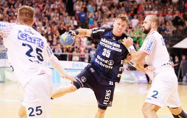 »Go-to-Guy« Kentin Mahé (Nr. 35) musste gegen Magdeburg um Zeljko Musa (Nr. 2) und Marko Bezjak Schwerstarbeit verrichten. (Foto: Sebastian Iwersen)