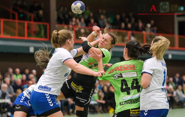 Es wurde ordentlich zugepackt. Merle Carstensen (Mitte) und der TSV Nord Harrislee hatten es gegen den TuS Lintfort bis in die Schlussphase nicht leicht. Fotos: Sven Geißler