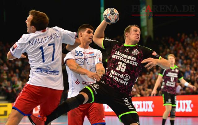 Kentin Mahé (am Ball) gewann mit der SG klar und deutlich gegen Ex-Kollege Petar Djordjic (Nr. 55) und Brest. (Foto:: Tim Riediger)
