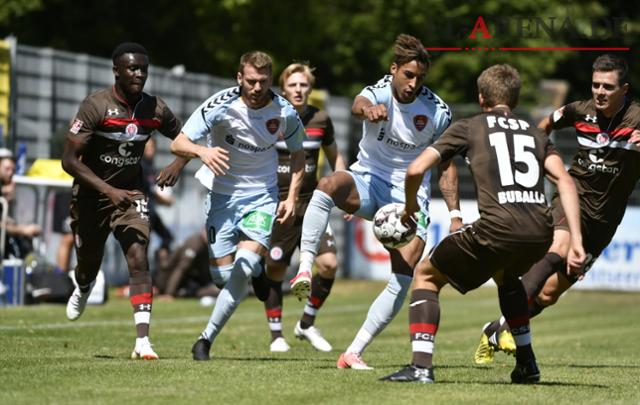 Die SC-Neuzugänge Gökay Isitan (Nr. 10) und Marvin Ibekwe im Duell mit St. Paulis Daniel Buballa. Foto: Tim Riediger