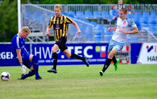 Bjarne Schleemann (r.) behielt vor Fremad-Keeper Frederik Nørgaard die Nerven und erzielte die 1:0-Führung für die Gastgeber. Foto: Sven Geißler
