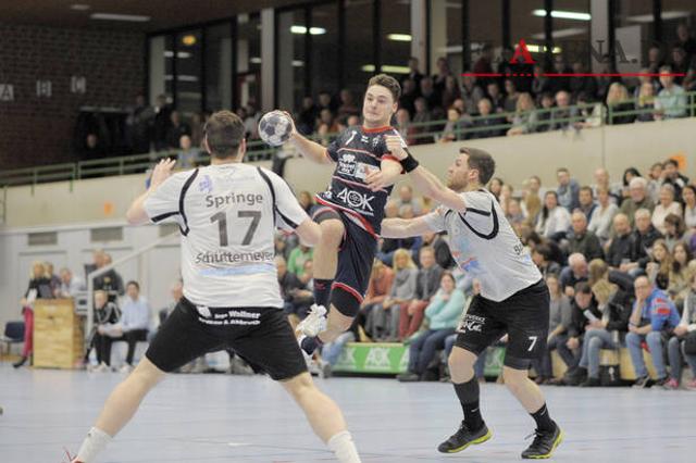 Flensburgs Dani Baijens versucht hier, sich gegen Maximilian Schüttemeyer (Nr. 17) und Jonas Borgmann (Nr. 7) von HF Springe durchzusetzen. (Foto: Rico Person)
