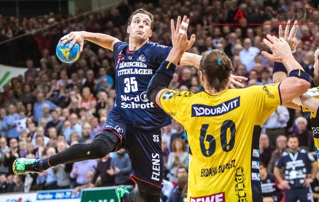 Kentin Mahé (will) will mit seiner SG Flensburg-Handewitt einen Sieg im letzten Saisonspiel. Gelingt das, und die Löwen um Kim Ekdahl Du Rietz (in gelb) patzen gleichzeitig beim TuS N-Lübbecke, dann wäre die SG neuer Deutscher Meister. (Archivfoto: Lars Salomonsen)