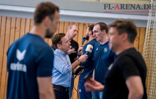 Dienstag stand neben dem Training auch ein Medientag an. Wenige Tage vor dem Saisonfinale sind SG-Trainer Maik Machulla (l.), Holger Glandorf und Tobias Karlsson (h. r.) gefragte Leute. Fotos: Martin Ziemer