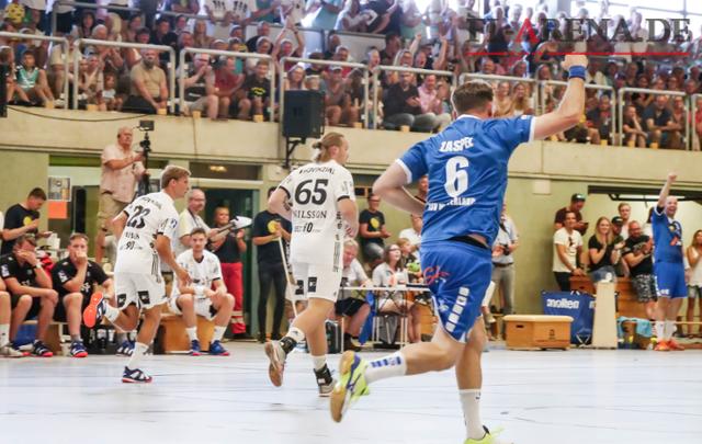 Alexander Zaspel (TSV Westerland) ballt die Faust. Ein Tor gegen den großen THW Kiel. Zwar setzte es die erwartet deutliche Niederlage, für die Gastgeber war das Aufeinandertreffen aber ein tolles Erlebnis. Foto: Sylt Connected