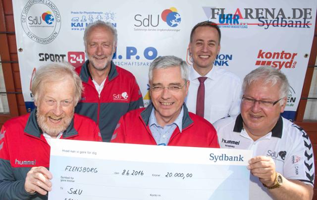 Holger Bruhn (bagerst t.v.), Kaj Andersen (forrest fra venstre), Jens A Christiansen (formand for holdets støtteforening) og Reinhard Jacobsen glæder sig over den gave, som Thomas Hansen havde til holdet. Sydbank har sponsoreret 20.000 kroner. (Foto: Tim Riediger)