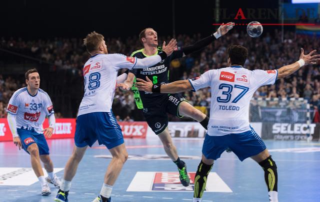 Nein, es lief längst nicht alles rund bei Linkshänder Holger Glandorf (dunkles Trikot) und seinen SG-Teamkollegen. Dennoch reichte es zum Sieg gegen Wisla Plock. (Foto: Tim Riediger)